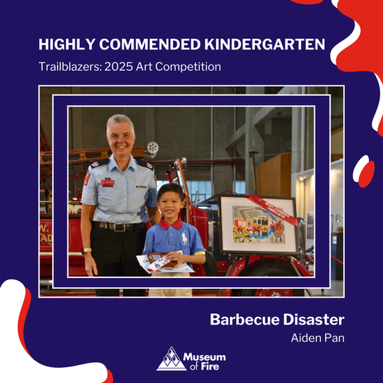 FRNSW were also represented at the event by Acting Commissioner Michael Morris, who presented the FRNSW Commissioner’s Choice Award to the winner Rebecca Feng (Year 6) for her work Unburned Courage where she received a FRNSW giftpack from the Museum. Rebecca's artwork will be displayed in the emergency services academy at Orchard Hills and will also be added to the Museum’s permanent collection. She describes her artwork: “I was inspired by women in firefighting, and their ‘unburned courage’. I took inspiration from a photo I found online and used to create something that symbolises the perception of women, and their bravery. This shows how far we have come today in our view of this society.”